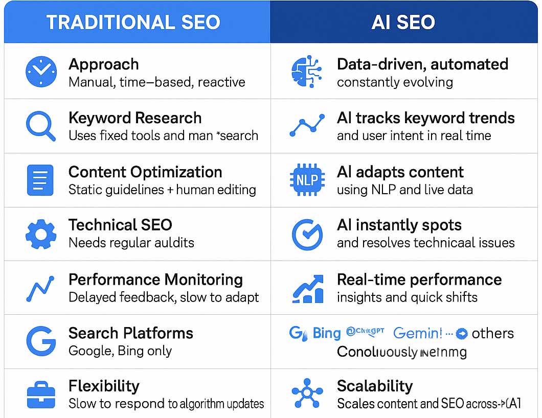 AI SEO is not just about using tools to generate content. It is a smarter, data-driven approach to optimizing websites using artificial intelligence. Instead of relying only on manual work, AI helps analyze patterns, predict outcomes, and improve decisions at scale.